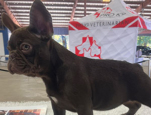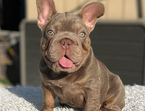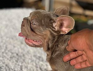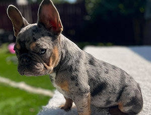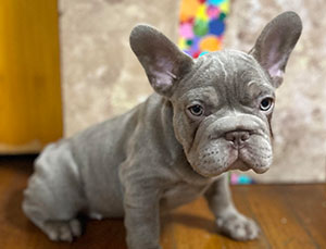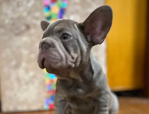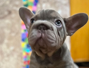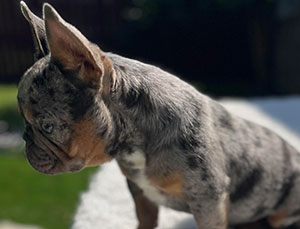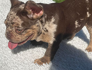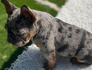 Mars, our newest French Bulldog puppy was just acquired and is a full blood French. He is blue and tan merle with specs of white. Although he is young now, this stud will be available to breed in 2021. Call for an appointment.